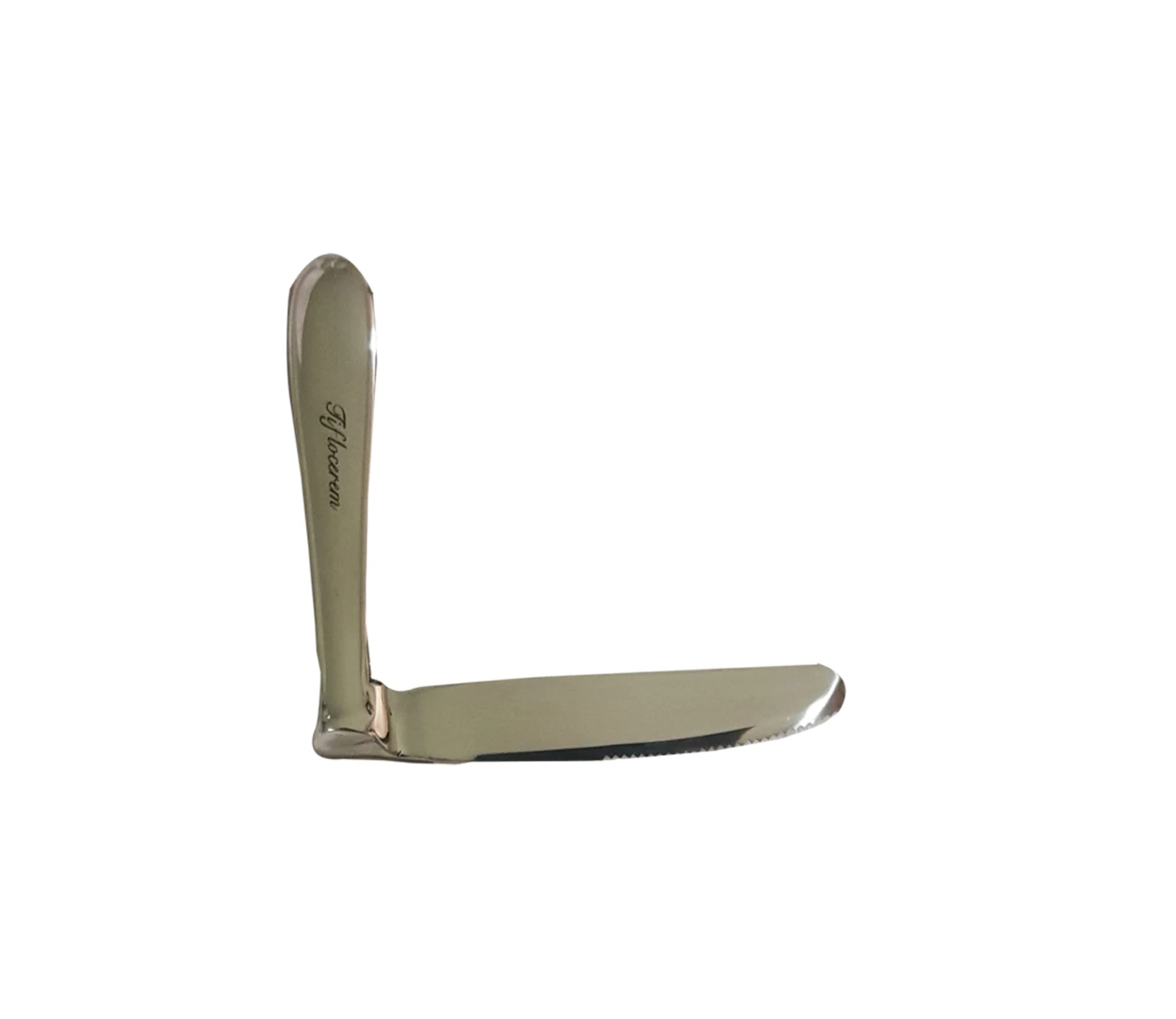 Vajilla adaptada confeccionada íntegramente en Acero Inoxidable pulido. Mango macizo con arabescos en relieve biselado. Posee dos filos serrucho y liso. Su hoja dispuesta a 90° del mango permite el mecanismo de corte hacia adelante y atrás.
